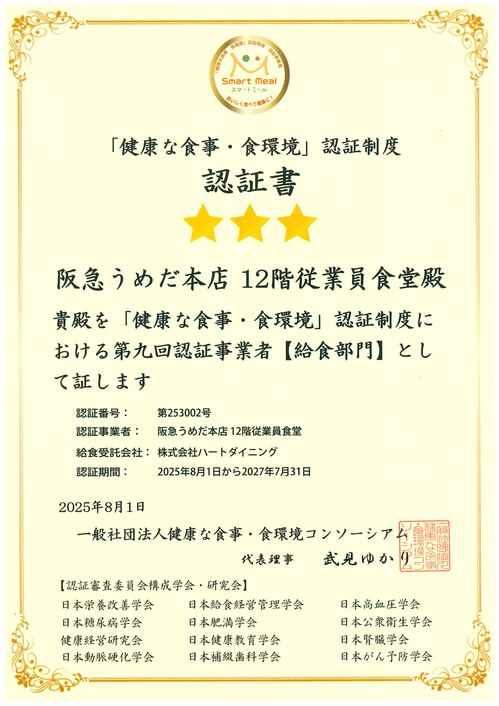 この度、弊社阪急うめだ本店12階 従業員食堂は、健康に配慮した食事を提供する証である「スマートミール認証」において、最高ランクの三ツ星を取得いたしました。